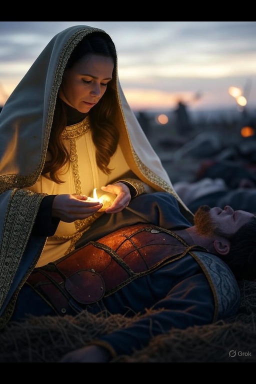 Elara, a human cleric of the goddess of healing, kneels beside a fallen warrior, her hands glowing with divine light as she channels restorative magic to mend his wounds. The battlefield is shrouded in chaos, yet her calm demeanor instills hope in her comrades. In the heart of a dark forest, Thalion, an elven cleric, raises his holy symbol high, summoning radiant energy to banish a horde of undead. The light erupts from his outstretched hands, illuminating the shadows and striking fear into the hearts of his foes. During a tense negotiation with a rival faction, Seraphine, a dwarven cleric, speaks with authority, her voice steady and filled with conviction. She invokes the blessings of her deity, ensuring that her words carry weight and inspire trust among the assembled leaders. As a storm brews on the horizon, Gideon, a half-orc cleric, stands resolute at the edge of a cliff, arms raised to the sky. He calls upon the storm to grant him strength, channeling the fury of the tempest to empower his next spell. In a sacred grove, Mira, a tiefling cleric, leads a group of followers in prayer, her voice harmonizing with the rustling leaves. She invokes the blessings of nature, seeking guidance and protection for her community as they face an impending threat.