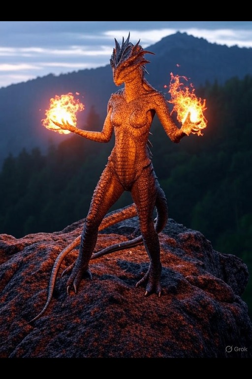 Elysia, a dragonborn sorceress, unleashes a torrent of fire upon her enemies, her scales glistening in the flames as she stands atop a rocky outcropping, embodying the raw power of her draconic heritage.