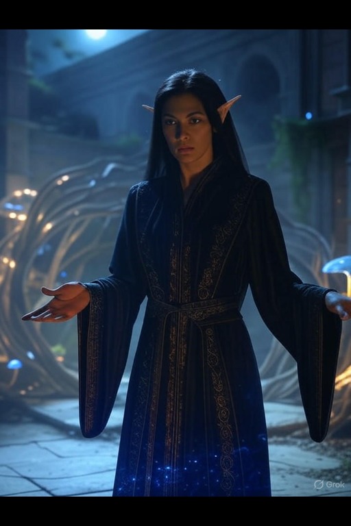 In the dim light of a moonlit courtyard, the Vampire Mastigos, a tall elven woman draped in flowing shadows, weaves a spell that ensnares her enemies in a web of darkness. Her piercing gaze glows with an unnatural light, revealing her mastery of the arcane.