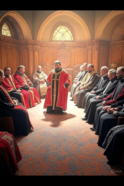 A Brotherhood theocracy intertwines governance with spiritual leadership, characterized by councils of clergy guiding civic life, with power derived from divine mandate and communal faith.