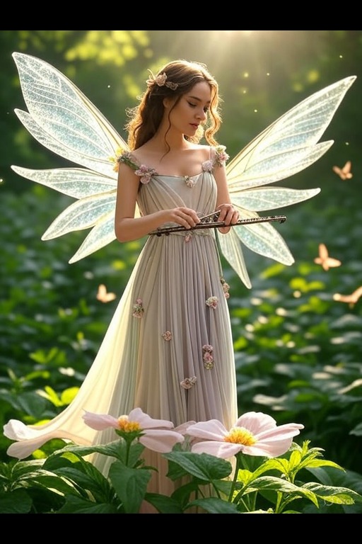 Lirael, a nimble fairy bard, dances gracefully on the petals of a blooming flower, her iridescent wings catching the sunlight as she plays a sweet melody, enchanting all creatures around her.