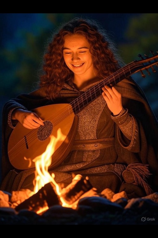 Brenna Bramblefoot, a halfling bard, strums her lute by the campfire, her curly hair illuminated by the flickering flames. With a mischievous grin, she weaves tales of adventure that captivate her companions.
