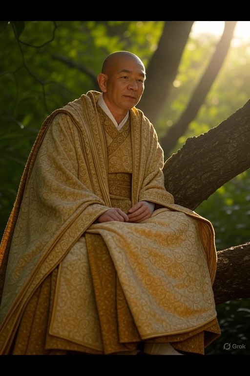 Kavi, a Vanara monk, swings gracefully through the treetops, his robes fluttering in the wind. With a serene expression, he balances on a branch, ready to meditate under the dappled sunlight filtering through the leaves.