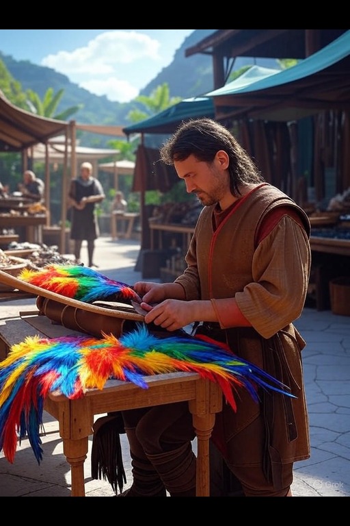 Bird Feathers (Parrot) are renowned for their striking colors and durability, making them a sought-after resource among artisans and traders. The process of obtaining these feathers begins with skilled hunters who employ traps or engage in careful tracking to catch the birds. Once captured, the feathers are meticulously skinned and prepared in the field to ensure freshness. This practice not only preserves the integrity of the feathers but also minimizes waste, as the remaining parts of the bird are utilized for other purposes, such as hides and meat. The rapid processing is essential in tropical environments, where heat and insects can quickly compromise the quality of the materials harvested. In addition to their aesthetic appeal, Bird Feathers (Parrot) serve practical purposes across various industries. Craftsmen in leatherworking incorporate these feathers into their designs, enhancing the visual allure of garments, accessories, and other leather goods. The vibrant hues can be dyed further or combined with other materials to create unique patterns, appealing to a wide range of consumers. Moreover, the cured meats derived from the birds are highly valued, providing nourishment and flavor that is well-regarded in many culinary traditions. These meats can be preserved for longer shelf life, catering to the needs of traders and those living in remote areas where fresh provisions may be scarce. The trade of Bird Feathers (Parrot) and associated products is an important economic activity in regions where these birds are abundant. Artisans and merchants often barter these resources, exchanging them for goods that may not be locally available. The vibrant feathers draw attention and can command high prices in markets, serving as both a symbol of wealth and an essential resource in various crafts. As hunters and gatherers continue to refine their techniques, the methods for harvesting and processing these feathers evolve, ensuring the sustainability of this crucial resource in the face of changing environmental conditions. The relationship between communities and their environment remains vital as they navigate the balance between utilization and conservation of these precious birds.