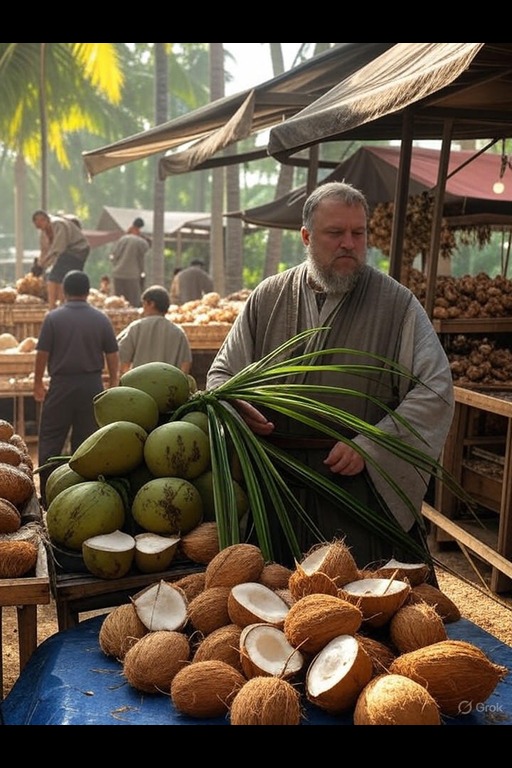 Coconut is a versatile resource cultivated in tropical wet forests, where the climate and soil contribute significantly to its growth. Traditional farming methods, influenced by the seasons, play a key role in determining the quality and yield of this crop. Surpluses of coconut are often traded with neighboring regions, as the resource is highly prized for its many uses. Caravans frequently seek preserved forms for long journeys and to ensure provisions during leaner seasons.