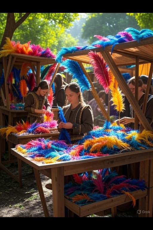 Decorative Feathers are prized for their fine surface and workability, making them a staple in various artisan crafts. Carefully shaped with small tools, these feathers offer versatility in their applications. Bundled and labeled by size, they serve both workshops and market traders alike. Their aesthetic appeal contributes to their popularity in decorative arts and textiles.