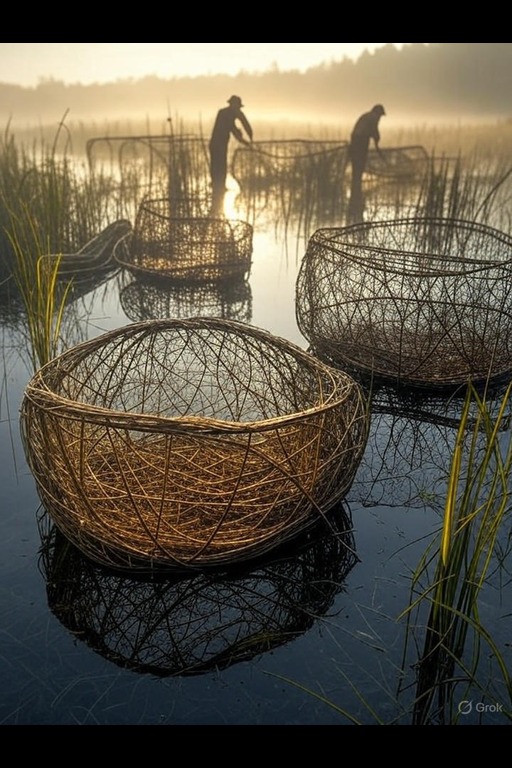 The construction of eel traps is a testament to the ingenuity of those who dwell in wetland areas. Typically fashioned from locally sourced materials, these traps often incorporate slats or nets that allow eels to enter while preventing their escape. The design varies, with some traps resembling small enclosures, while others are more akin to funnels leading into a confined space. The process of setting these traps requires not only skill but also a deep understanding of the eels' behavior, including their feeding and migratory patterns. Such knowledge is essential to maximize the harvest during the optimal weather windows when eels are most active and abundant. After the traps are set, the waiting game begins. Harvesters frequently return to check on their traps, a task that demands patience and keen observation. The timing of these checks is crucial; too early, and many eels will escape; too late, and the eels may perish in the traps, reducing their value. The harvested eels are then swiftly removed from the traps, ensuring they remain fresh and suitable for processing. This immediate handling is vital, as the quality of the eels can diminish rapidly if not properly cared for after capture. Once captured, the eels are prepared for various applications, including consumption and trade. They can be preserved through smoking, salting, or pickling, greatly extending their shelf life and making them a staple in many diets. Eel preserves are highly sought after, often regarded as delicacies in bustling trade markets. In addition to being consumed directly, processed eel products can also be transformed into beverages or included in other culinary creations, further enhancing their value within the food trade. The versatility of eels contributes significantly to their demand, ensuring that they remain an important resource for both local and distant markets. Eel traps, therefore, not only serve as tools for harvesting but also embody a way of life rooted in tradition and sustainability. They represent the balance between human ingenuity and the natural world, illustrating how communities adapt to their environments. The careful cultivation and processing of eels highlight the importance of meticulous observation and timing, making eel traps a cornerstone of wetland agriculture and trade.