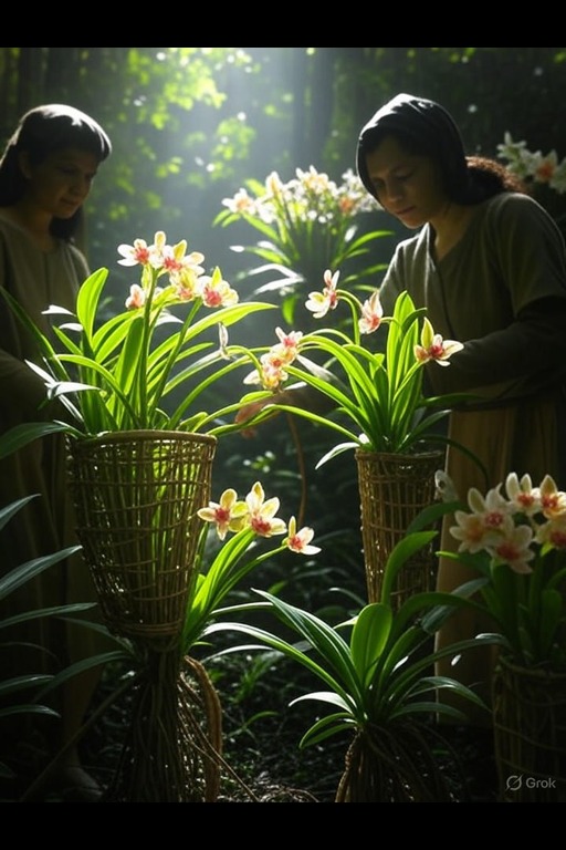 Rare Orchid Blossoms are delicate flowers that thrive in the shaded embrace of towering trunks and canopy branches. Their fragile petals, renowned for their beauty and fragrance, make them highly sought after in various industries. Harvesters skillfully climb to great heights to collect these blossoms, employing woven frames to safeguard their precious cargo during transport. This meticulous gathering process contributes to the orchids’ allure and value in trade and craftsmanship.