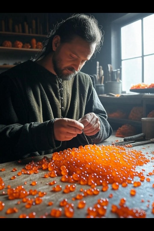 Salmon Roe (Preserved) is a prized resource known for its fine texture and workability. Artisans select it carefully, utilizing small tools to craft a variety of products. Each piece is meticulously bundled and labeled by size, facilitating both workshop production and market trade. This resource plays a crucial role in several industries, particularly in artisan crafts and decorative arts.