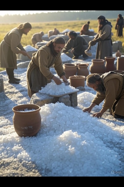 Salt licks are naturally occurring deposits of mineral-rich salt, commonly found in grassland biomes. These deposits can be dug or collected from outcrops and bars, where they form over time through geological processes. Artisans and laborers grade the salt on site, separating useful pieces for various applications. The remaining fines are dried and packaged for use in kilns or as mortar in construction projects.